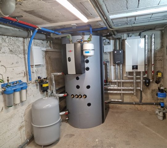 Die Anlage lässt sich gut mit einem fossilen (ÖL oder Gas) verbinden um Spitzenzeiten abzudecken, meist bei älteren Gebäuden die nicht so gut gedämmt sind. Hier produziert die Wärmepumpe mind. 90 % der benötigten Wärme.
